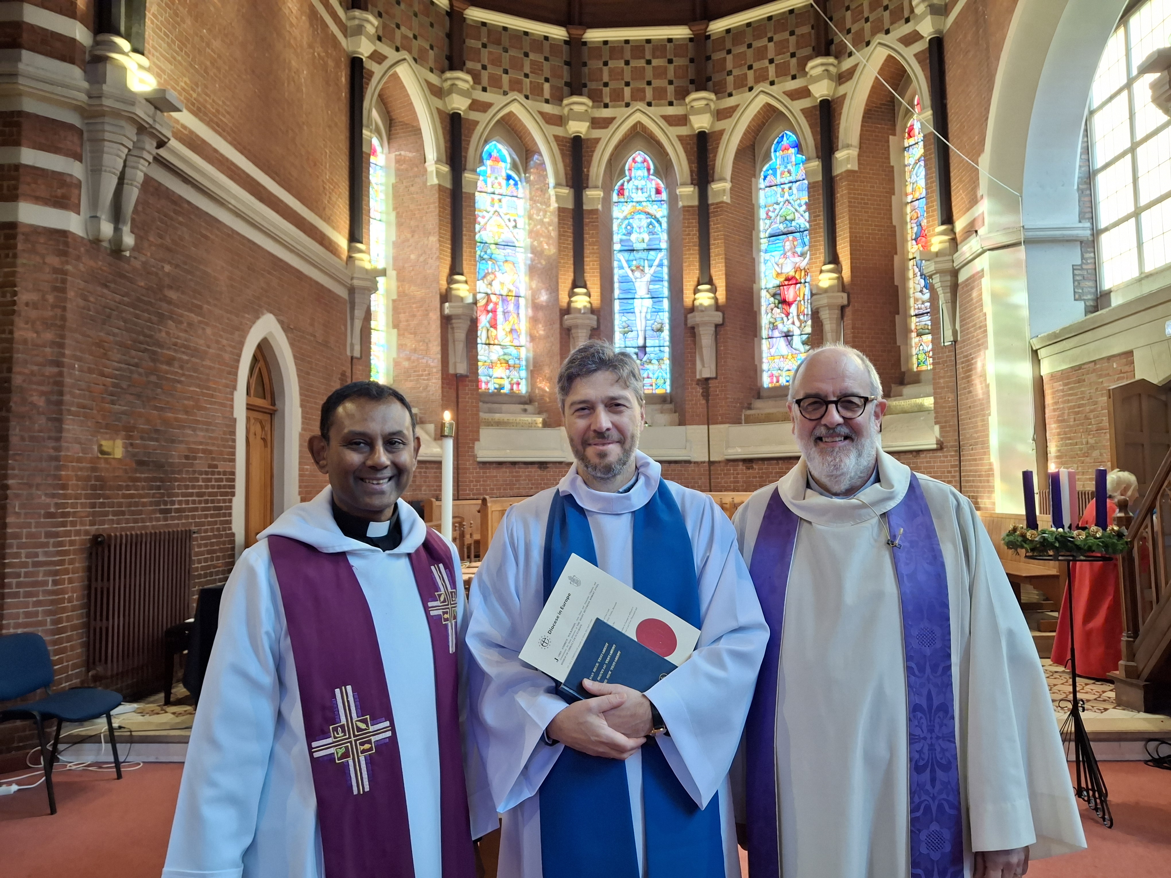 Pictured below: Jairo Ares Blanco, with Revd Canon Arani Sen and Revd Canon John Wilkinson, following his Licensing as a Reader at Holy Trinity Brussels for which the Friends kindly sponsored his Reader Scarf.