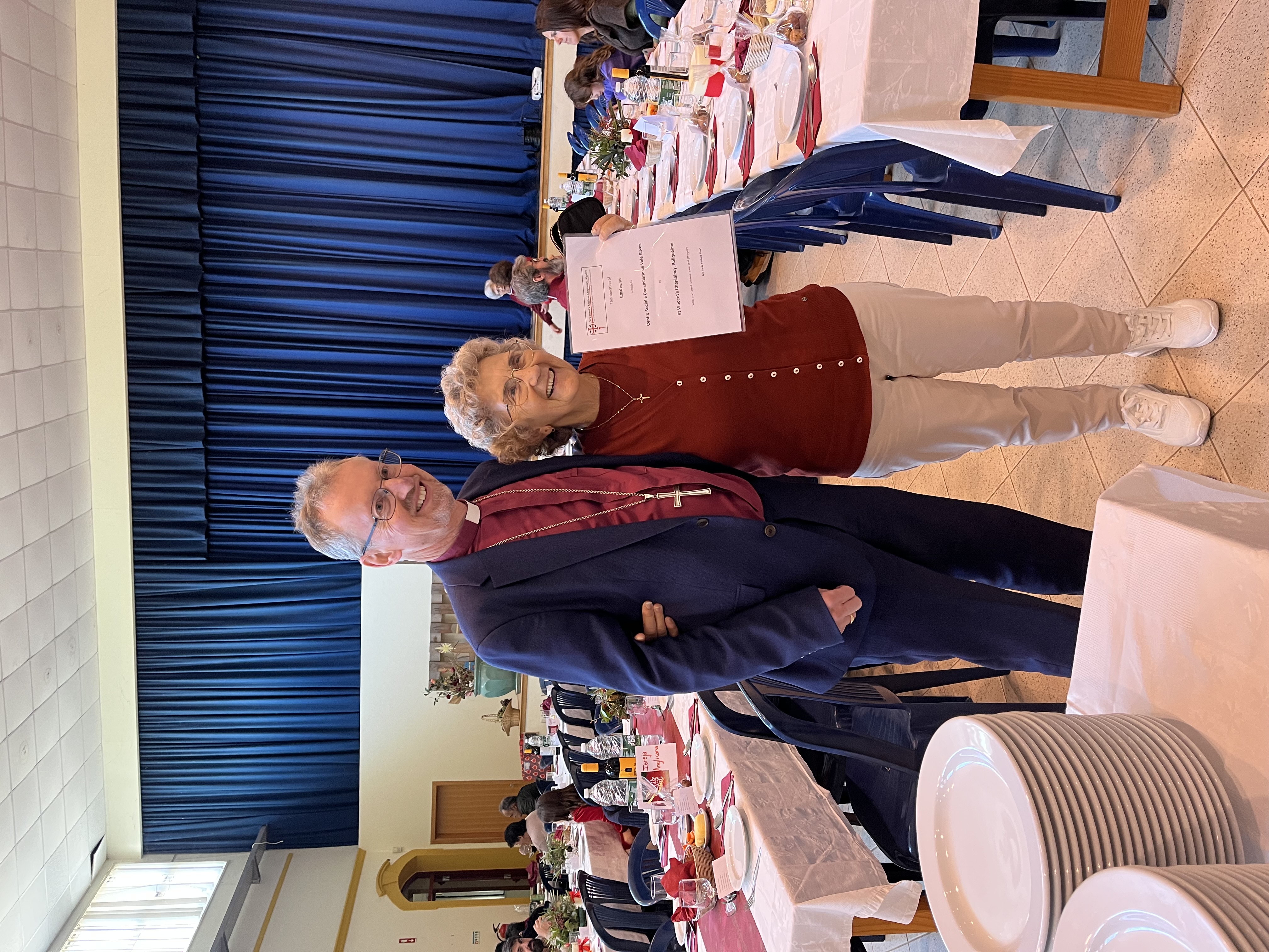 Bishop Robert with Dra Armanda - he has just presented her with a certificate indicating that the sum of €5000 had been paid into the Community Centre’s bank account on behalf of the St Vincent's Chaplaincy.