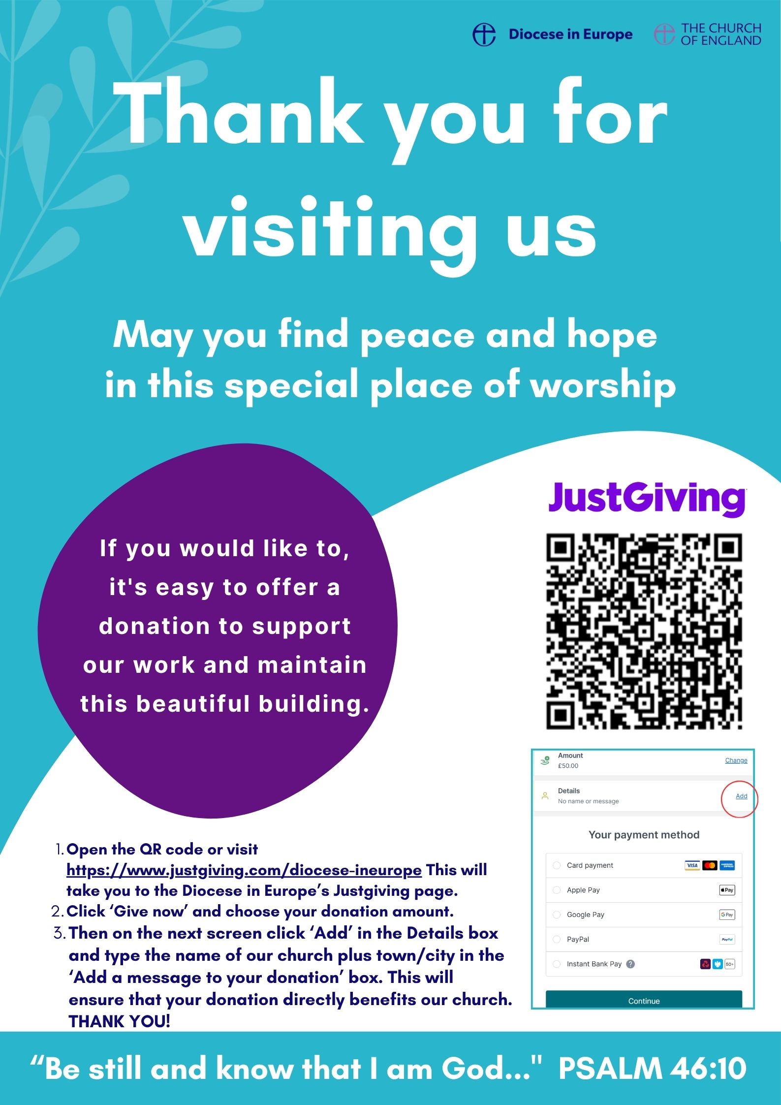 If you are using the Diocese in Europe’s JustGiving page, download the poster at the bottom of this webpage. It has the JustGiving QR code on it already – you just need to insert your chaplaincy’s logo or name at the end of the page.